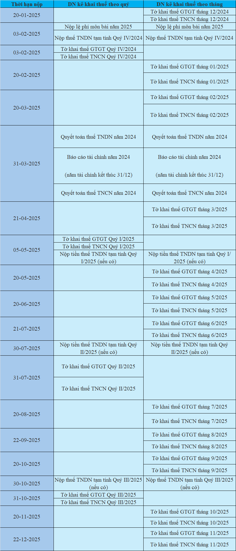 III. Lịch nộp tờ khai thuế chi tiết năm 2025