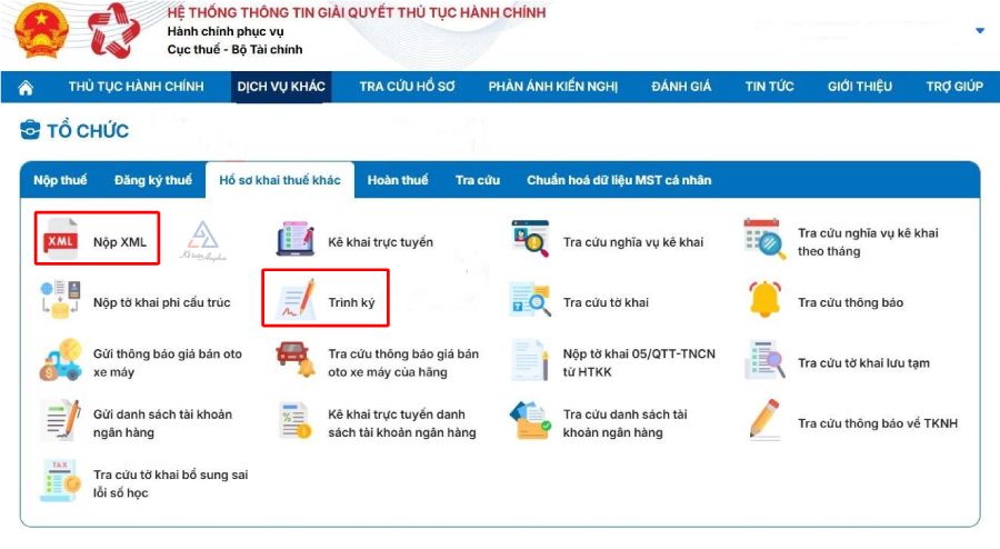 Chọn mục “Dịch vụ khác” ➜ chọn “Hồ sơ khai thuế khác” ➜ chọn “Trình ký” hoặc “Nộp XML” tùy hình thức muốn nộp tờ khai;