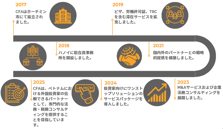 CFAは、外国人個人および組織がベトナムにおいて合法的に設立・運営・発展していく過程を支援する、プロフェッショナルなコンサルティング会社です。私たちは、会社設立、税務コンプライアンス、就労許可証・在留許可を含む包括的なサービスを提供し、「正確・迅速・効果的」をモットーとしています。